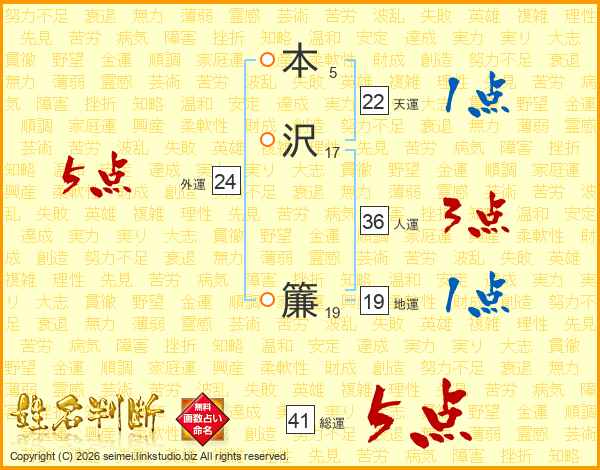 本沢簾さんの総運は41画の5点!