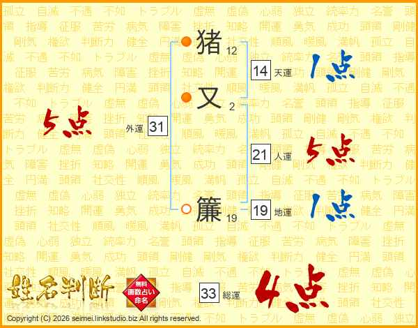 生活面を象徴する運勢です。外部から受ける影響力を表し、結婚運、家庭運や職場、環境への順応性を表します。総運から人運を引いた画数。姓や名が1文字の場合を除く。