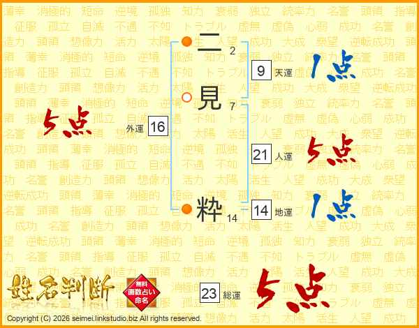 二見粋さんの総運は23画の5点!