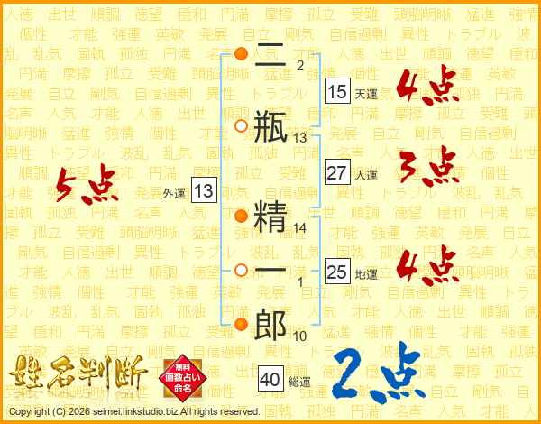 生活面を象徴する運勢です。外部から受ける影響力を表し、結婚運、家庭運や職場、環境への順応性を表します。総運から人運を引いた画数。姓や名が1文字の場合を除く。