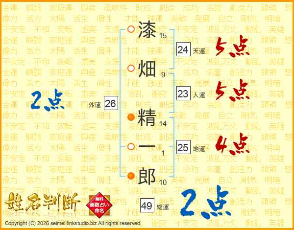 漆(15画)畑(9画) 精(14画)一(1画)郎(10画)