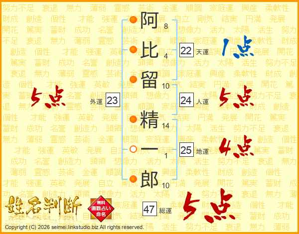 阿(8画)比(4画)留(10画) 精(14画)一(1画)郎(10画)
