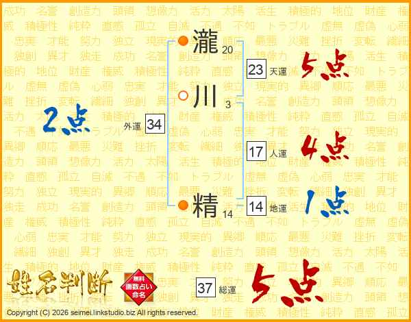 生活面を象徴する運勢です。外部から受ける影響力を表し、結婚運、家庭運や職場、環境への順応性を表します。総運から人運を引いた画数。姓や名が1文字の場合を除く。