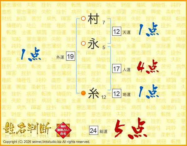 生活面を象徴する運勢です。外部から受ける影響力を表し、結婚運、家庭運や職場、環境への順応性を表します。総運から人運を引いた画数。姓や名が1文字の場合を除く。