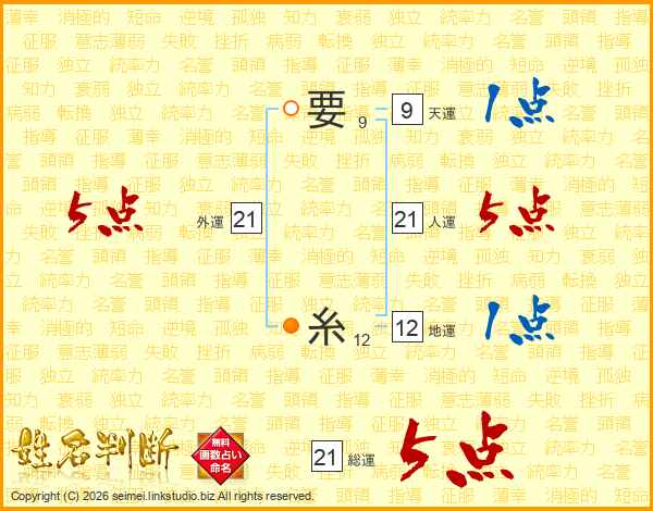 生活面を象徴する運勢です。外部から受ける影響力を表し、結婚運、家庭運や職場、環境への順応性を表します。総運から人運を引いた画数。姓や名が1文字の場合を除く。