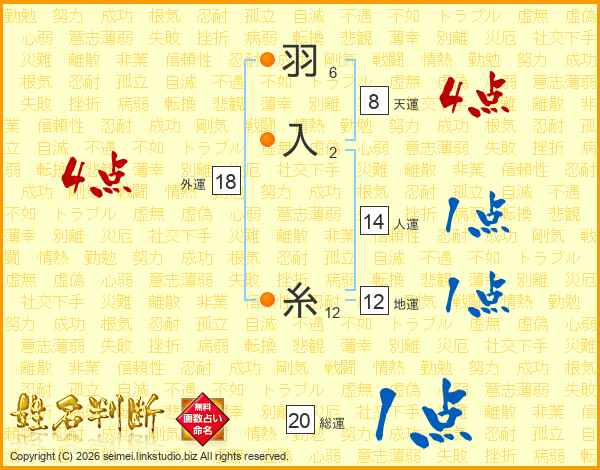 生活面を象徴する運勢です。外部から受ける影響力を表し、結婚運、家庭運や職場、環境への順応性を表します。総運から人運を引いた画数。姓や名が1文字の場合を除く。
