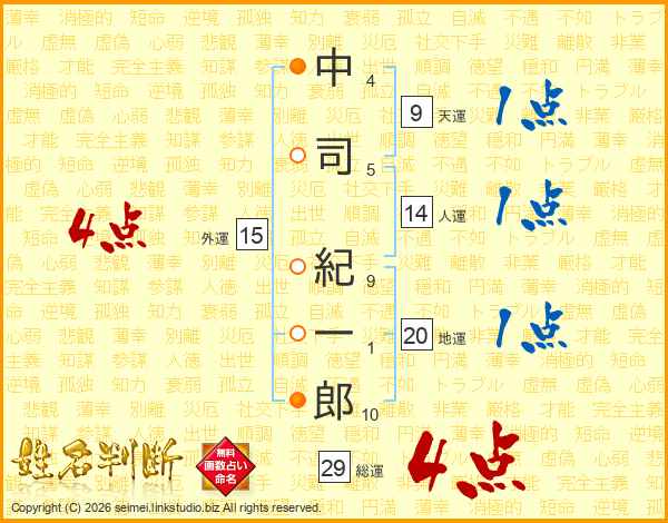 中(4画)司(5画) 紀(9画)一(1画)郎(10画)