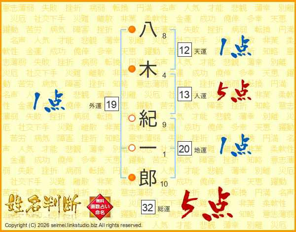 八木紀一郎さんの総運は32画の5点!