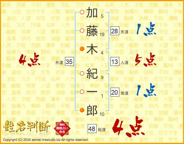 加藤木紀一郎さんの総運は48画の4点!