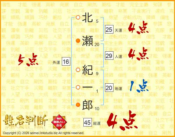 北(5画)瀬(20画) 紀(9画)一(1画)郎(10画)