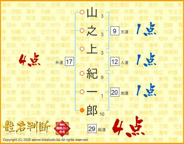 山(3画)之(3画)上(3画) 紀(9画)一(1画)郎(10画)