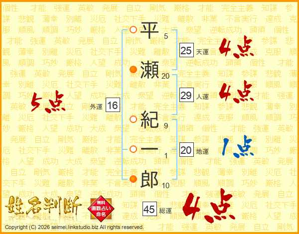 平(5画)瀬(20画) 紀(9画)一(1画)郎(10画)