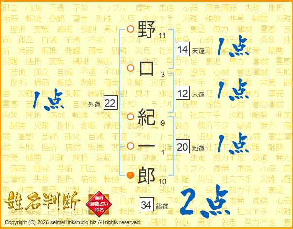 野(11画)口(3画) 紀(9画)一(1画)郎(10画)