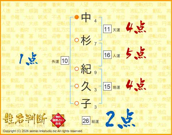 中(4画)杉(7画) 紀(9画)久(3画)子(3画)