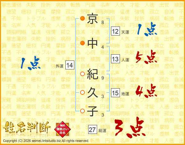 京(8画)中(4画) 紀(9画)久(3画)子(3画)