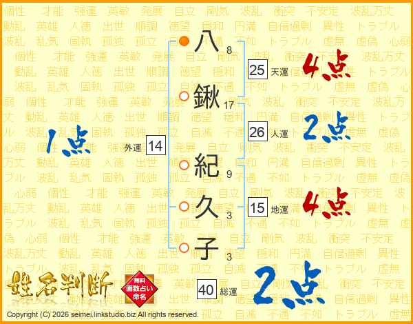 八鍬紀久子さんの総運は40画の2点!
