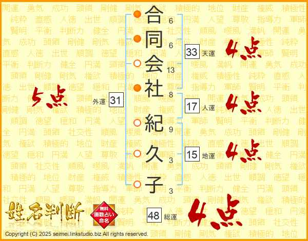 合(6画)同(6画)会(13画)社(8画) 紀(9画)久(3画)子(3画)