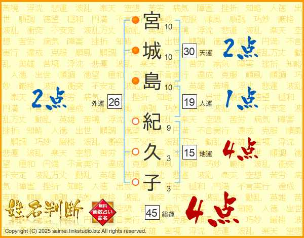 宮(10画)城(10画)島(10画) 紀(9画)久(3画)子(3画)