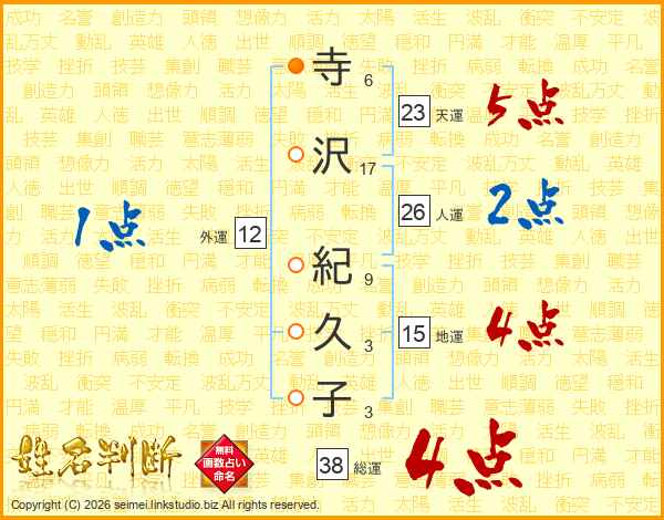 寺(6画)沢(17画) 紀(9画)久(3画)子(3画)