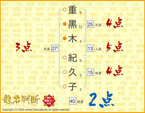 重(9画)黒(12画)木(4画) 紀(9画)久(3画)子(3画)