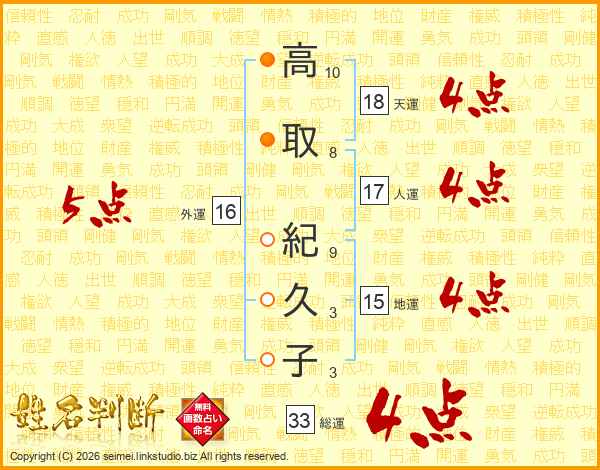 高(10画)取(8画) 紀(9画)久(3画)子(3画)