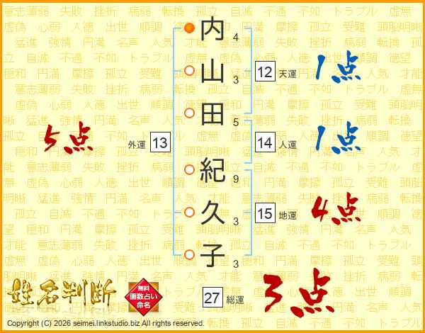 内(4画)山(3画)田(5画) 紀(9画)久(3画)子(3画)