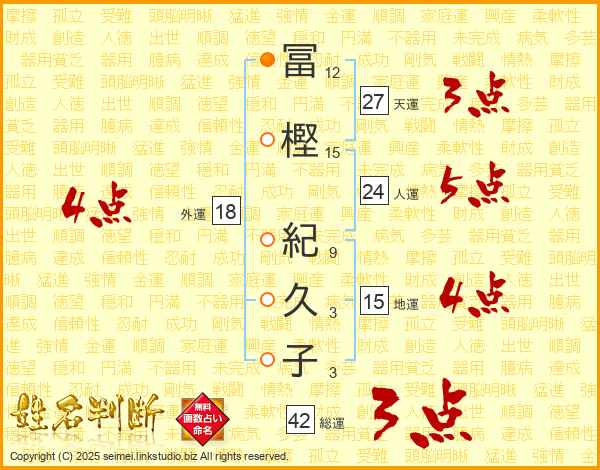 冨(12画)樫(15画) 紀(9画)久(3画)子(3画)