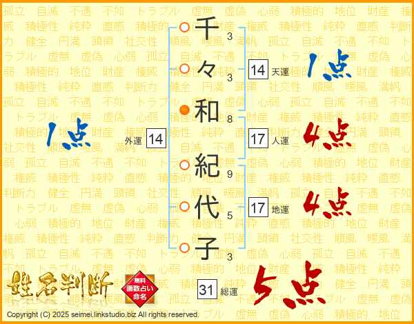千(3画)々(3画)和(8画) 紀(9画)代(5画)子(3画)