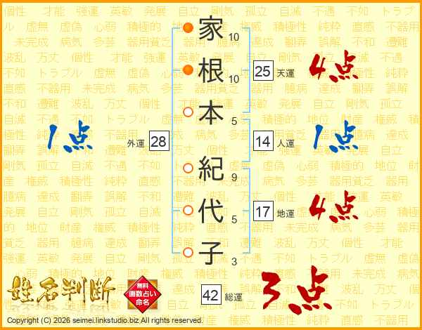 家(10画)根(10画)本(5画) 紀(9画)代(5画)子(3画)