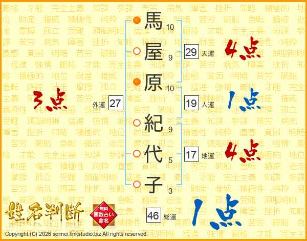 馬屋原紀代子さんの天運は29画の4点!