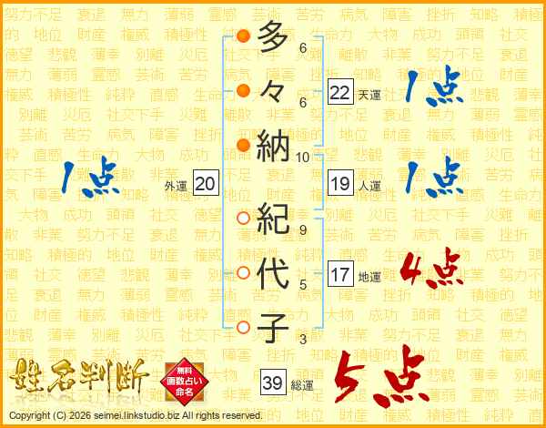 多々納紀代子さんの総運は39画の5点!