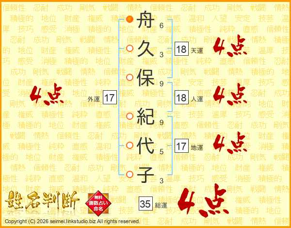 舟(6画)久(3画)保(9画) 紀(9画)代(5画)子(3画)