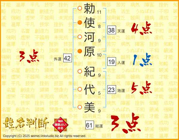 勅(11画)使(8画)河(9画)原(10画) 紀(9画)代(5画)美(9画)