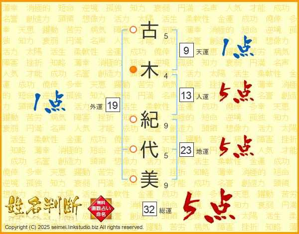 古(5画)木(4画) 紀(9画)代(5画)美(9画)