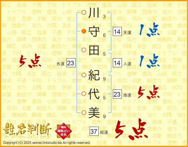 川(3画)守(6画)田(5画) 紀(9画)代(5画)美(9画)