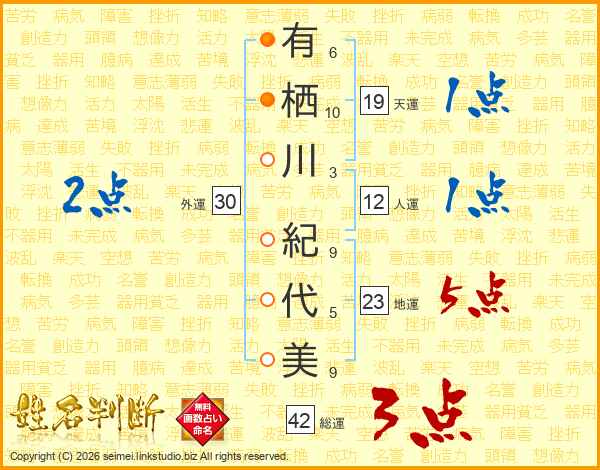 有(6画)栖(10画)川(3画) 紀(9画)代(5画)美(9画)