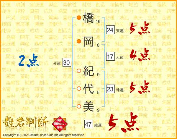 橋(16画)岡(8画) 紀(9画)代(5画)美(9画)