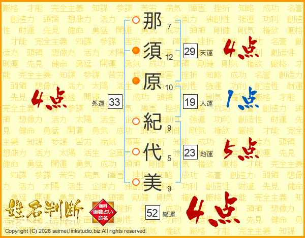 那(7画)須(12画)原(10画) 紀(9画)代(5画)美(9画)