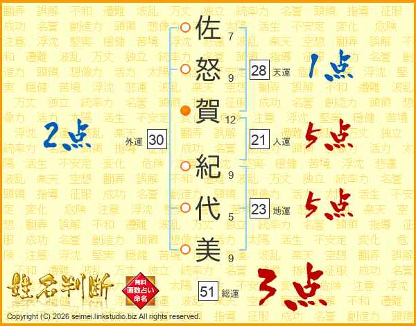 佐(7画)怒(9画)賀(12画) 紀(9画)代(5画)美(9画)