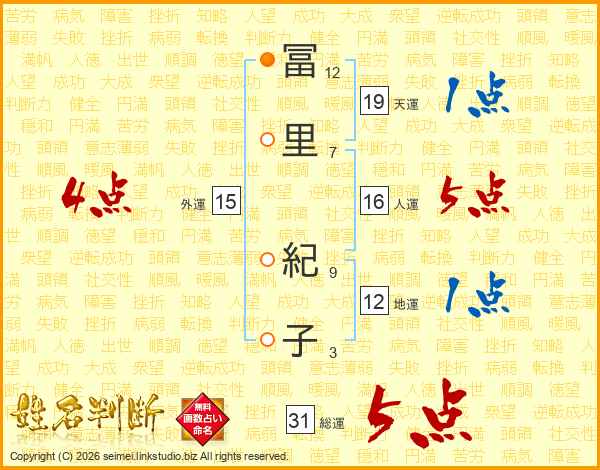 冨(12画)里(7画) 紀(9画)子(3画)