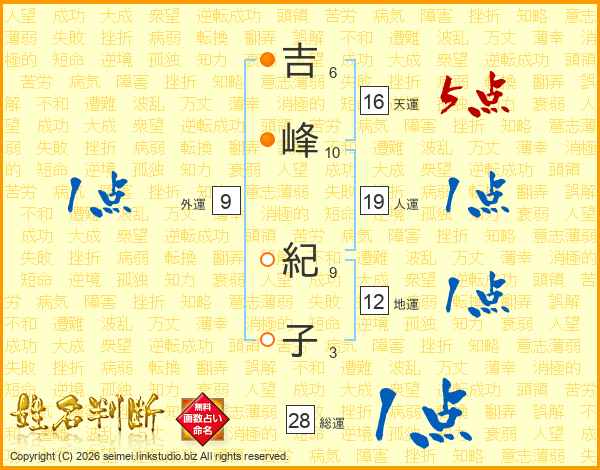 吉(6画)峰(10画) 紀(9画)子(3画)