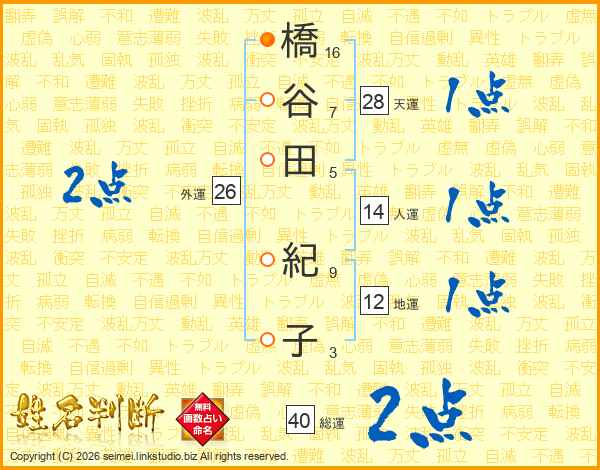 橋(16画)谷(7画)田(5画) 紀(9画)子(3画)