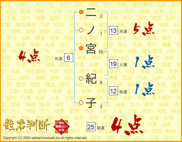 二(2画)ノ(1画)宮(10画) 紀(9画)子(3画)
