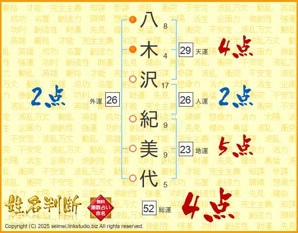 八木沢紀美代さんの総運は52画の4点!