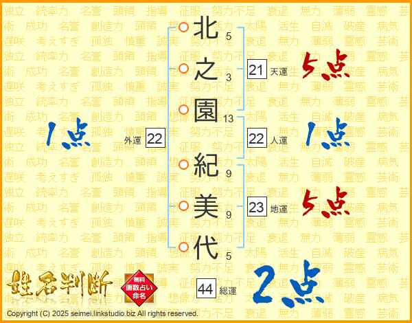 北(5画)之(3画)園(13画) 紀(9画)美(9画)代(5画)