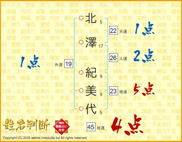 北澤紀美代さんの総運は45画の4点!