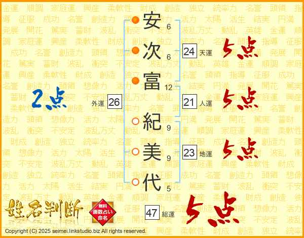 安(6画)次(6画)富(12画) 紀(9画)美(9画)代(5画)