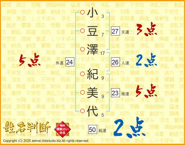 小(3画)豆(7画)澤(17画) 紀(9画)美(9画)代(5画)