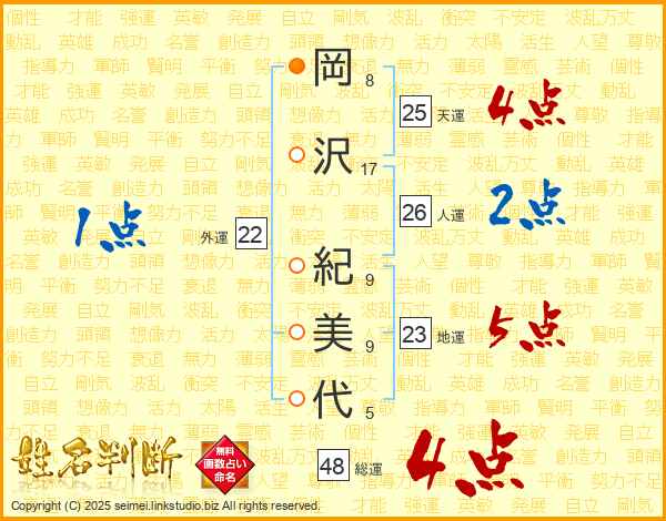 岡沢紀美代さんの天運は25画の4点!