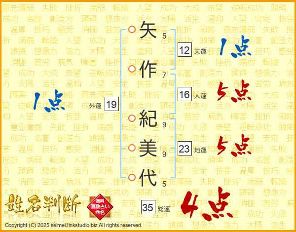 矢(5画)作(7画) 紀(9画)美(9画)代(5画)
